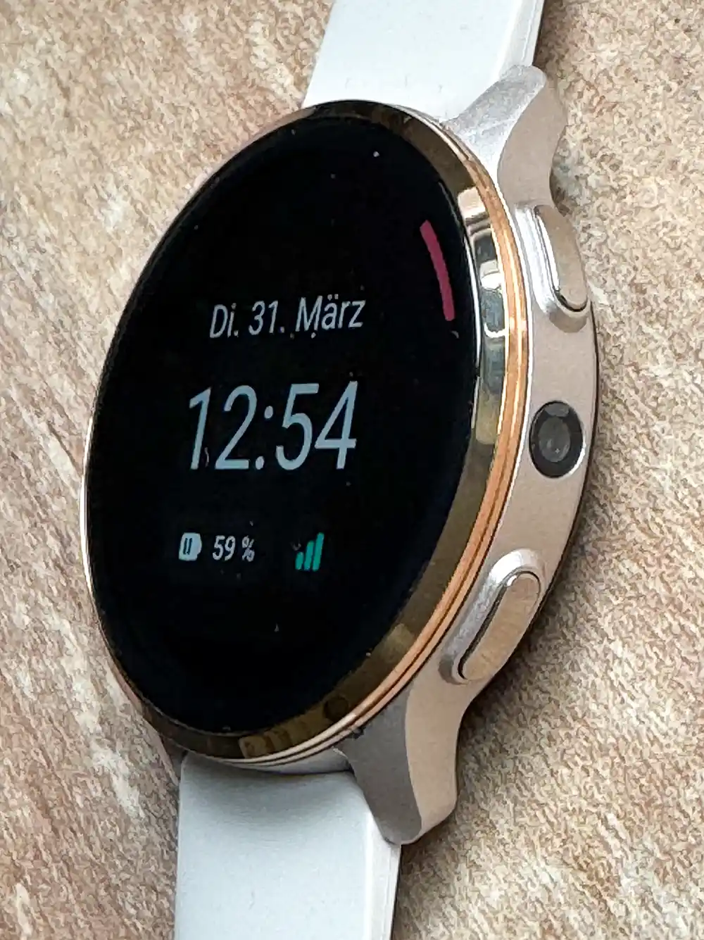 Eine runde Smartwatch mit weißem Armband zeigt die Uhrzeit 12:54, das Datum 31. März und einen Batteriestand von 59 % an.